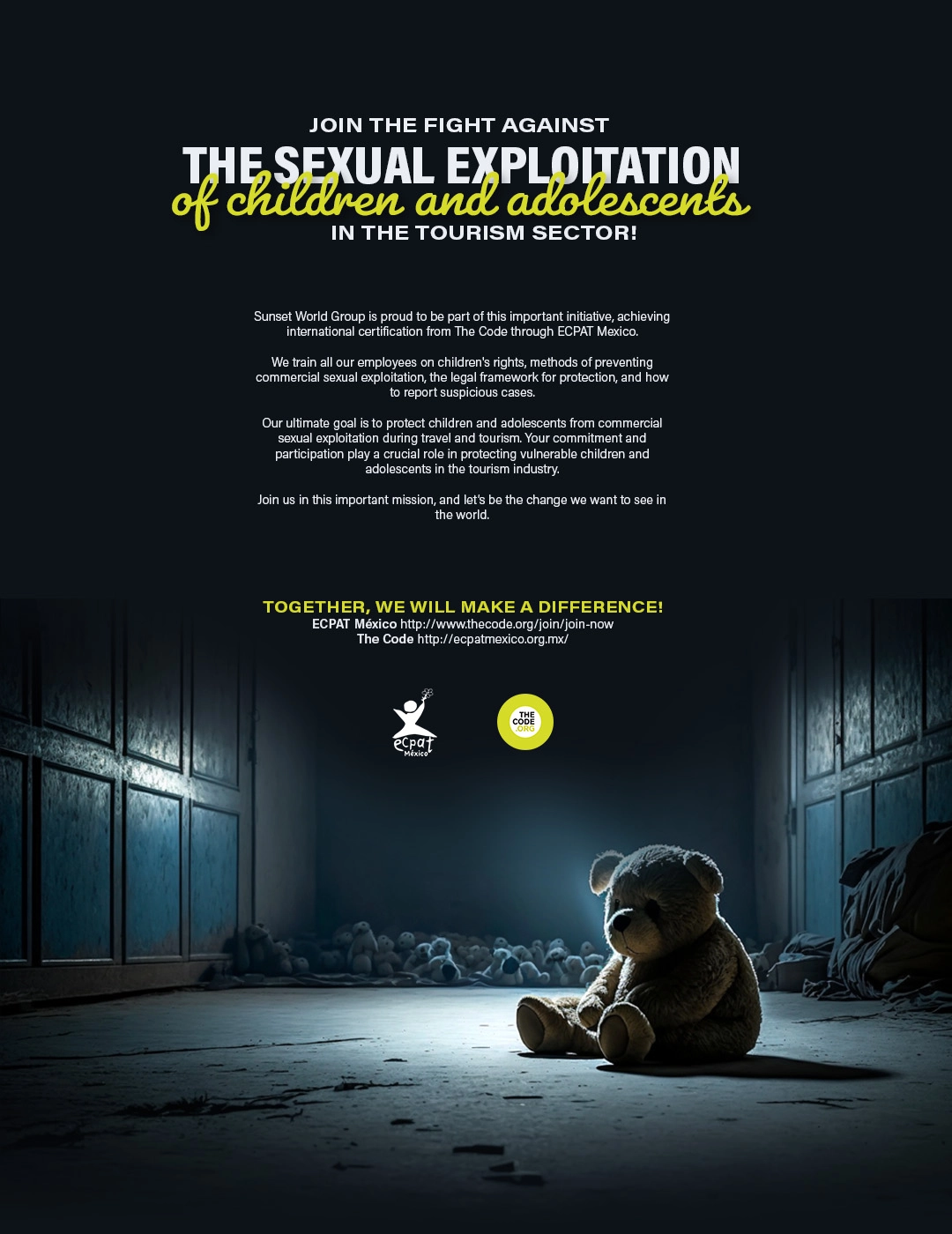 With The Code international certification, which was achieved together with ECPAT Mexico, who are the representatives in the country for The Code, we are joining the National Code of Conduct. Reaffirming our zero-tolerance stance towards any behavior that threatens children and adolescents safety and well-being.
